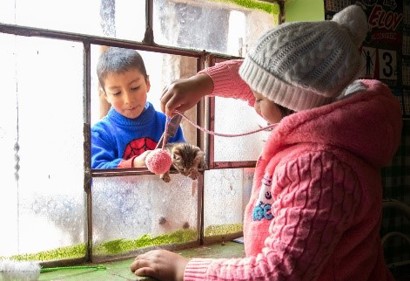 Kl. 13:30 Á meðan börnin bíða eftir því að maturinn verði klár, leika þau sér við kettlingana. Mamma þeirra segir að kettlingarnir verði að fá nýtt heimili.